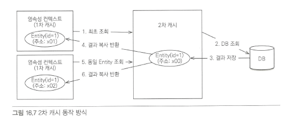 1차 캐시는 영속성 컨텍스트 내로 스코프가 한정되었지만 2차 캐시는 어플리케이션 전체를 스코프로 가진다.