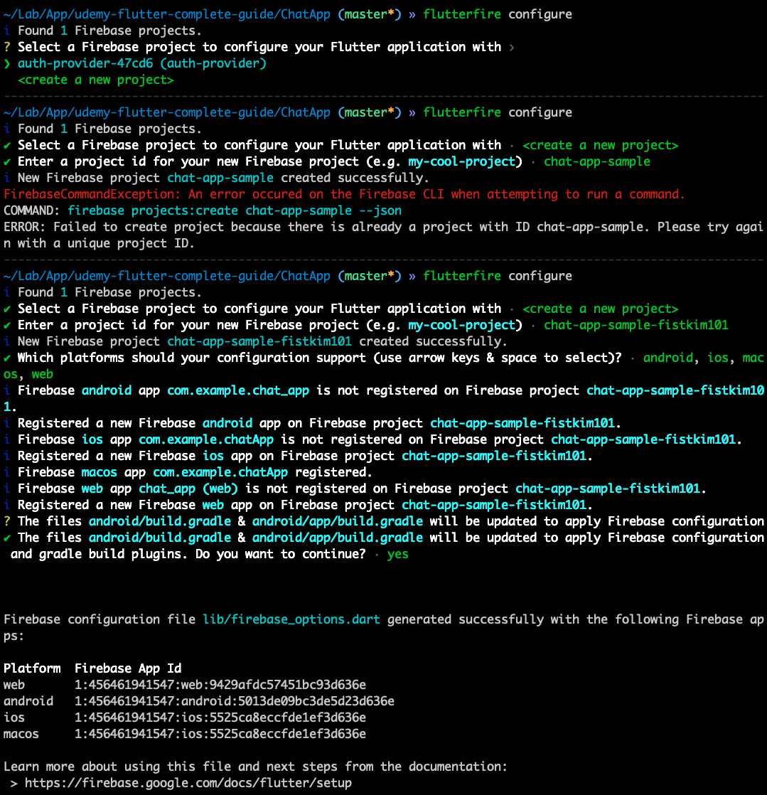 4. flutterfire configure 명령어를 통해서 연결 설정을 잡아준다. 기존 프로젝트 연결로 실습하지 않았고 create a new project 로 실습했다.