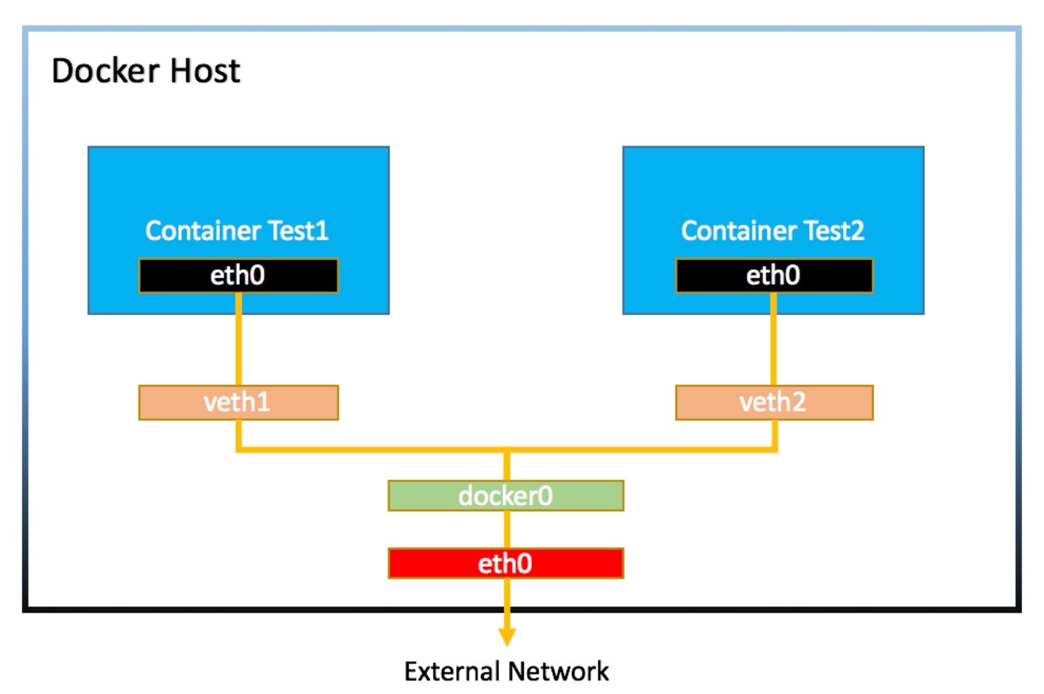 1) 생성되는 도커 컨테이너는 namespace 로 격리되고, 그 상태에서 통신을 위한 네트워크 인터페이스(eth0)를 할당받는다 2) host PC의 veth interface 가 생성되고 도커 컨테이너 내의 eth0 과 연결한다(컨테이너의 네트워크 격리를 달성하기 위해 선택한 방법인 것 같다) 3) host PC의 veth interface 는 docker0 이라는 다른 veth interface 와 연결된다 4) 이 과정이 컨테이너가 추가될 때 마다 반복된다