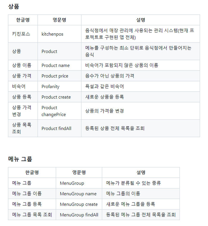 요구사항, 용어사전, 모델링 작성이 실습이었는데 옮기기 편해서 링크와 함께 내용까지 아래에 옮겼다. 실제로 다른 프로젝트 수행시 아래 과정을 그대로 답습했는데 도메인 이해도를 높히는데 개인적으로 많은 도움이 되었다.